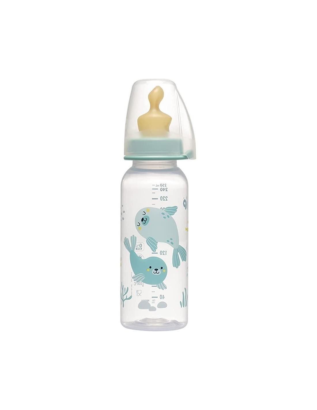 Sticluta biberonului are o capacitate de 250 ml si este confectionata din polipropilena necasanta de inalta calitate (PP), cu desene dragalase in culori vesele, fara BPA, fiind sigura pentru alimente. Marcajele clare de pe biberon asigura o masurare precisa pentru alimente.